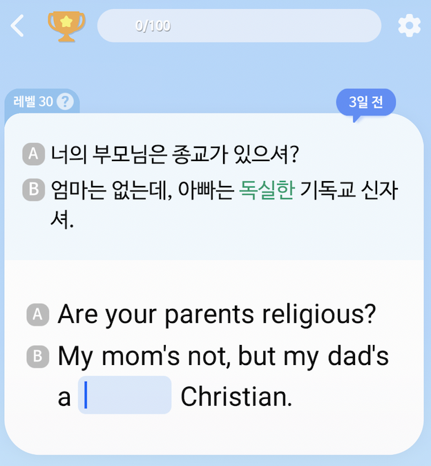 개인적으로 불편했던 점 한가지는, 단어를 먼저 보여주지 않고 문장에서 바로 맞춰야 한다는 점입니다.