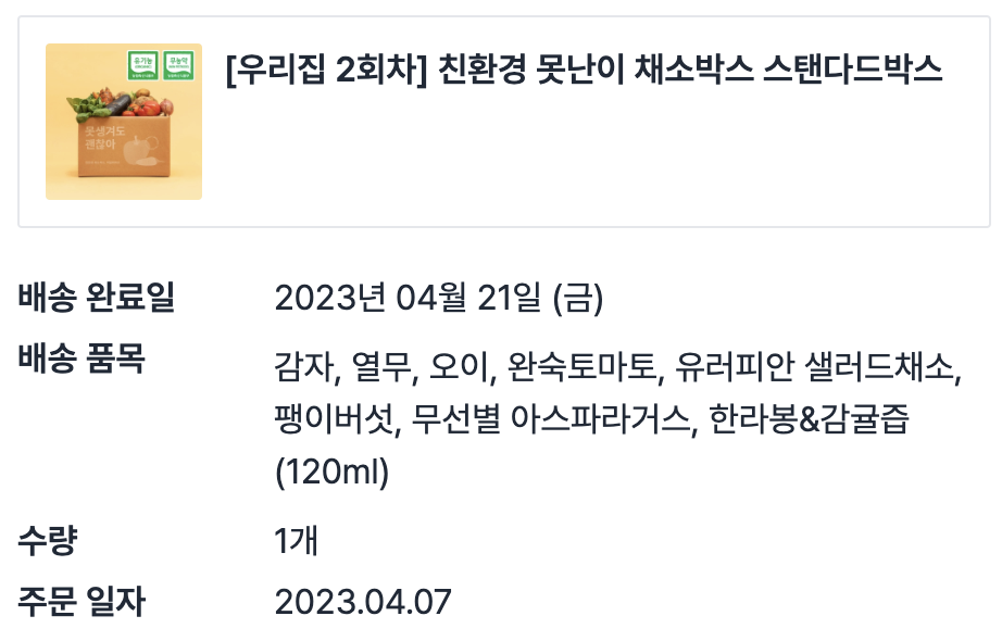 1회차때는 기본 구성 채소를 그대로 받았고, 2회차부터는 마트에서 구하기 쉬운 채소는 빼고 잘 안먹는 채소들을 좀 더 넣는식으로 구성을 바꿔서 받았어요.
