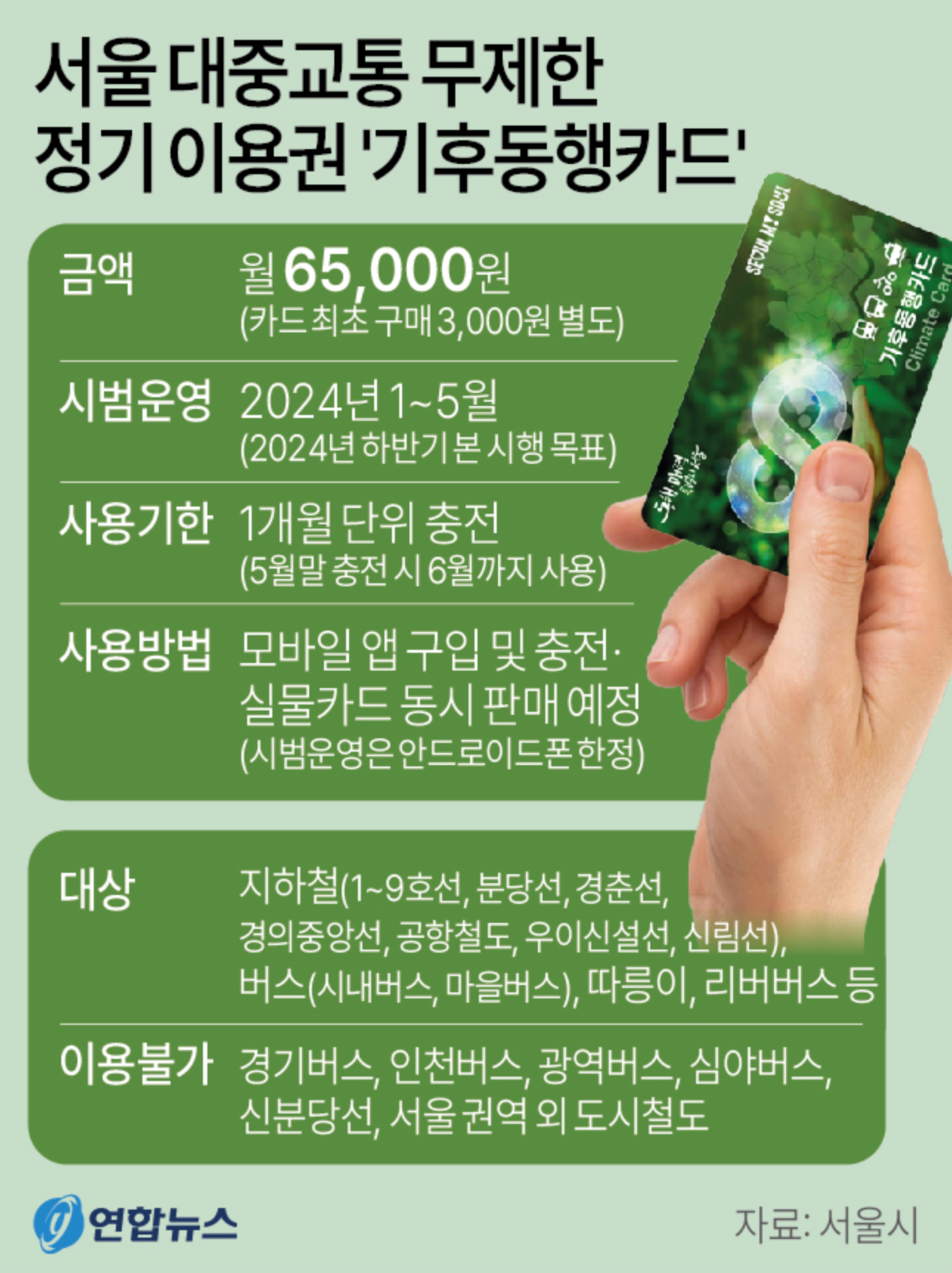 기후동행카드 - 대중교통 무제한, 따릉이 이용, 가격, 운영 일정, 이용범위, 운영 배경, 기대효과